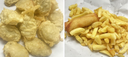 6 scallops 2 west coast whitebait patties and 1 scoop of chips.